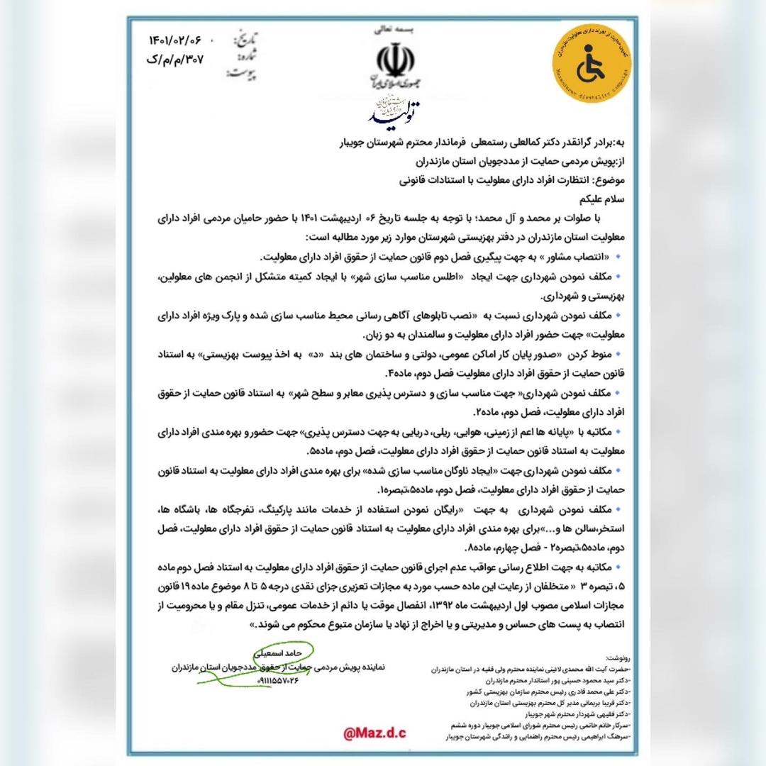برگزاری جلسه رییس انجمن معلولین ضایعه نخاعی استان به اتفاق آقای اسماعیلی نماینده پویش مردمی حمایت از حقوق مددجویان استان مازندران با شهردار و رییس شورای شهر و نماینده فرماندار و رییس اداره بهزیستی شهرستان جویبار